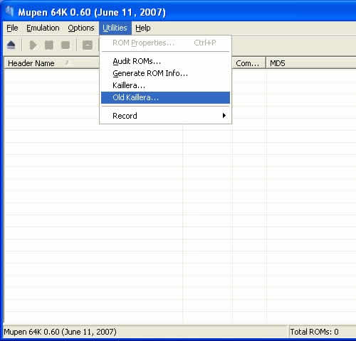 This is it. Use the screenshot below and verify that you are using these plugins BEFORE looking for games online. Just trust me on this one okay? Now you are ready to play online! Open Mupen64K and go to Utilities > Kaillera. As you see in this screenshot below, you can select either Kaillera (a newer interface) or the Old Kaillera (older interface). I have chosen to show you Old Kaillera, but it makes no difference which one you use.