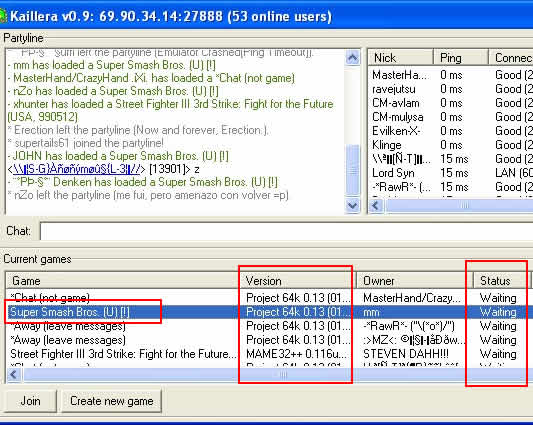 After you enter the IP Address and click on the "Connect" button in Kaillera, you will be viewing this window (see screenshot below). Some explanation needed. First, "Game" listings, you are looking for Perfect Dark, obviously. At the time of the screenshot there weren't any games for me to show you. Next is the "Version". This is important because you need to find a Perfect Dark game that is using Mupen64K. Just check what version first before joining up with a game that you won't be able to play in. Players out there are still learning that Mupen64K is THE emulator to run Perfect Dark. You will still find people using Project64K to play Perfect Dark. And no, it doesn't play properly! The last point is "Status", which means unless it says waiting, you won't be able to join in the game. You also have the option of choosing "Create new game" from which you can select Perfect Dark from your list of games, and then you will have an actual game room created. You will wait there and chat will people until you decide to start the game.